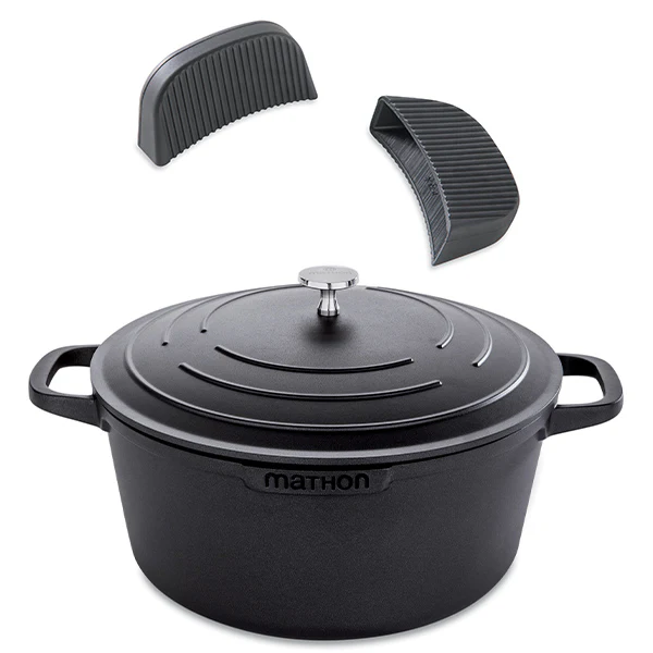 Lot cocotte légère ronde en fonte d’aluminium 28 cm et deux maniques en silicone Mathon