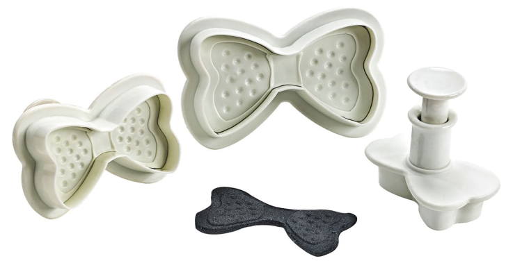 Concevez de superbes noeuds papillon avec ce kit de trois découpoirs à poussoir. Le poussoir permet l’extraction facile de la pâte découpée et en même temps de marquer sur la pâte des motifs en relief.