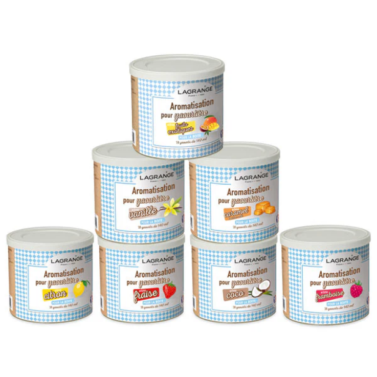 Les amateurs de yaourts faits maison apprécieront ce lot de 7 arômes pour yaourts de la marque Lagrange pour ajouter de la saveur à leur fin de repas. Citron, framboise, fraise et fruits exotiques pour de délicieux yaourts aux fruits ou encore coco, vanille ou caramel pour finir sur une touche de douceur.