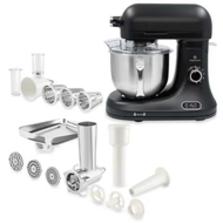 Le kit complet Mathon contient le robot pâtissier avec balance intégrée ainsi que les 2 kits d’accessoires pour préparer de la viande hâchée ou trancher et râper des légumes.