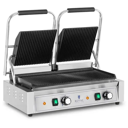 La machine à panini double RCPKG-3600-R est un appareil de cuisson professionnel qui se destine tant aux restaurants d’hôtel, aux établissements de restauration rapide et aux services de traiteur qu’aux particuliers. Ce matériel de restauration 10057 convient à une multitudes d’applications et il est idéal pour préparer des en-cas chauds tels que des paninis, des sandwichs, des légumes grillés, des burgers ou des steaks grâce à sa surface de cuisson très spacieuse en deux parties.