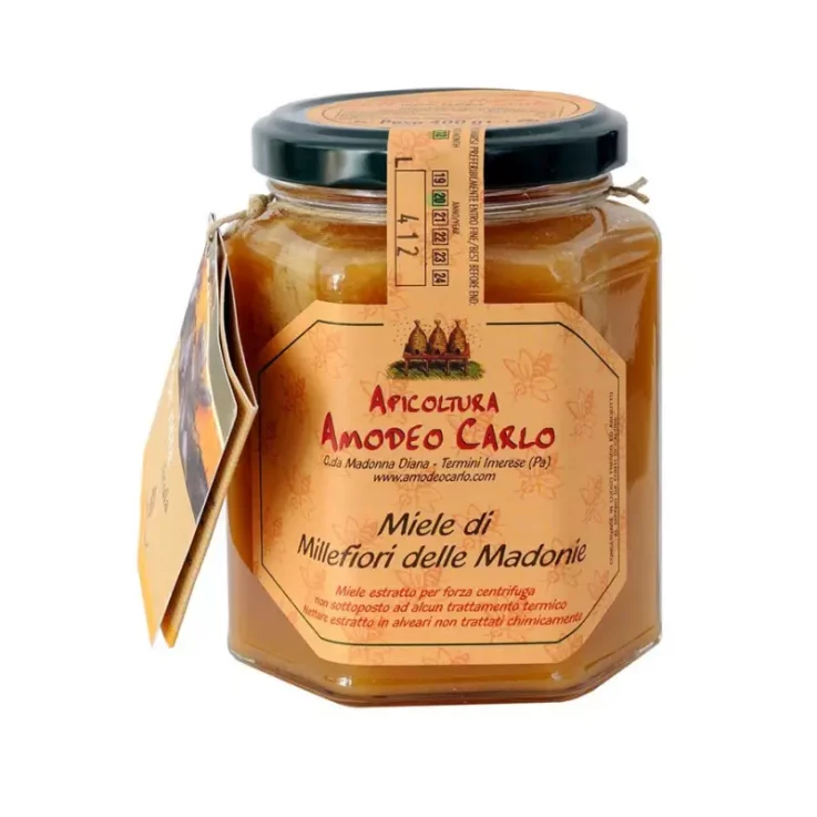 Miele Millefiori delle Madonie di Ape Nera Sicula Amodeo Carlo is a honey produced on the mountainous ridge of the Madonie, in the northern part of Sicily, where Carlo Amodeo has also established pure Sicilian bee stations. The colour is dark amber but may vary depending on crystallisation. The smell and flavour are also generally delicate but can vary in intensity.