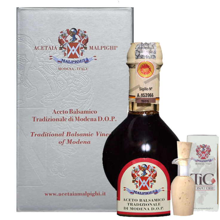 Vinaigre balsamique traditionnel “Affinato” (vieilli) DOP – Acetaia Malpighi di Modena, âgé d’au moins 12 ans, dans la bouteille exclusive de 100 ml désignée par le Consortium de protection du vinaigre balsamique traditionnel de Modène complet avec boîte, livret et véritable bouchon avec verre intégré bec verseur et bouchon en liège dans une boîte supplémentaire. (Dosatore in vetro suffiato e Astuccio)