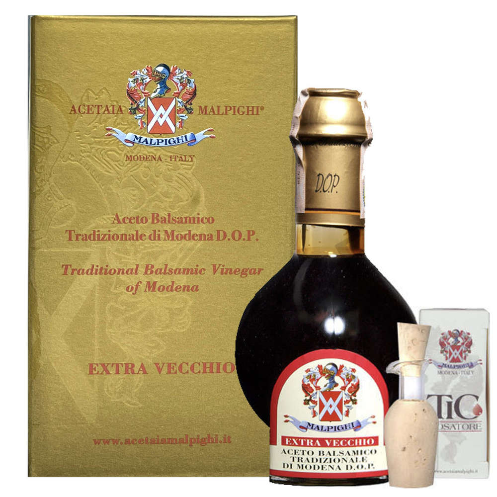 “Extravecchio” Vinaigre Balsamique Traditionnel DOP – Acetaia Malpighi di Modena, âgé d’au moins 25 ans, dans la bouteille exclusive de 100 ml spécifiée par le Consortium pour la Protection du Vinaigre Balsamique Traditionnel de Modène complet avec boîte , livret et véritable bouchon en liège avec bec en verre intégré et fermeture en liège dans une boîte supplémentaire. (Dosatore in vetro suffiato  e Astuccio)