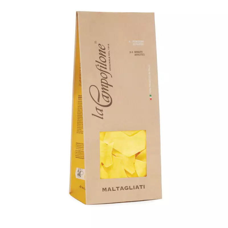 Maltagliati with Egg from the La Campofilone pasta factory is a rustic pasta format characterised by its irregular shape. Their dense and tenacious texture, obtained thanks to bronze wire-drawing and flaking, make them perfect for absorbing any sauce. Their delicate eggy flavour enhances both simple and more structured dishes. They cook in 2-3 minutes in boiling water and are ideal for about 4 servings. Thanks to their versatility, they are excellent in pea soups, with chickpeas or beans, in baked pies or served in hot broth, for a traditional dish with an authentic taste. Maltagliati La Campofilone, come from a short and sustainable supply chain in which only fresh eggs from hens raised on the land using non-intensive methods are used.