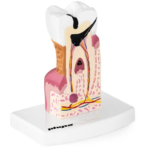 Cette maquette constitue une reproduction fidèle de la molaire humaine, réalisée à l’échelle 6:1. Les trois sections de la dent — couronne, collet, racine — y sont illustrées, au même titre que les structures internes telles que la dentine et la pulpe. De plus, les nerfs et les vaisseaux sanguins y sont illustrés avec un grand réalisme, tout comme certaines affections courantes comme la carie et la pulpite.