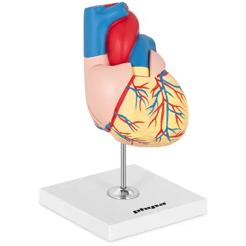 Cette maquette anatomique recrée le cœur humain à l’échelle 1:1. Les éléments constitutifs de l’organe sont reproduits en détail avec un grand réalisme. La paroi antérieure du cœur est amovible, ce qui permet de mieux examiner les composantes telles que les ventricules, les valvules et les oreillettes – mais aussi la veine cave supérieure, la veine cave inférieure, l’artère pulmonaire, les veines pulmonaires et l’aorte. L’échelle choisie permet de faire une démonstration très claire des liens qui unissent les différentes parties du cœur humain, ainsi que des fonctions de ce dernier.