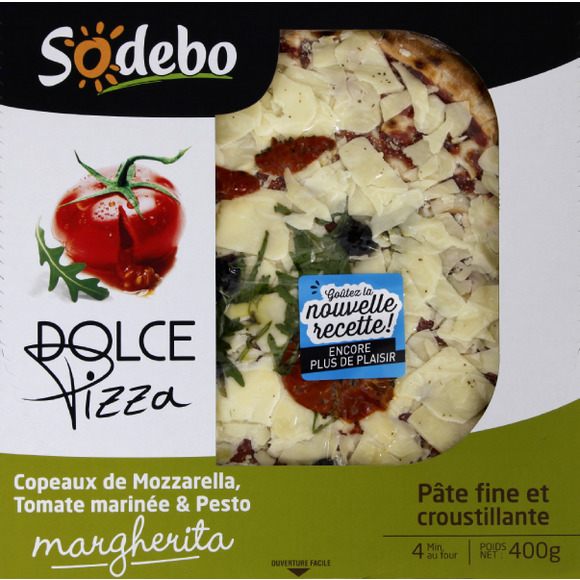 Pizza pâte fine garnie de mozzarella, de tomate marinée, de pesto provençal et de roquette. Pays de fabrication : FRANCE DLC minimum garantie: 7 jours Sodebo Sodebo 85607 Montaigu Cedex