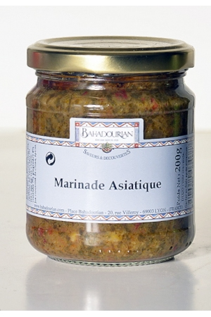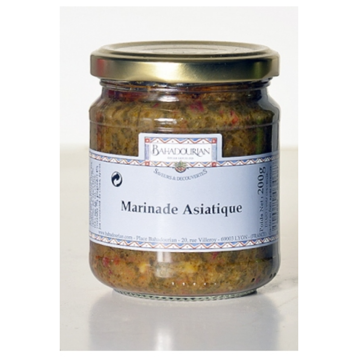 • Ingrédients : Oignons, huile de tournesol, poivrons rouges 9%, poivrons verts 9%, carottes, ail, sauce soja 7% (eau, SOJA, BLE, sel, alcool), coriandre 7%, gingembre 4%, jus concentré de citron, épices.