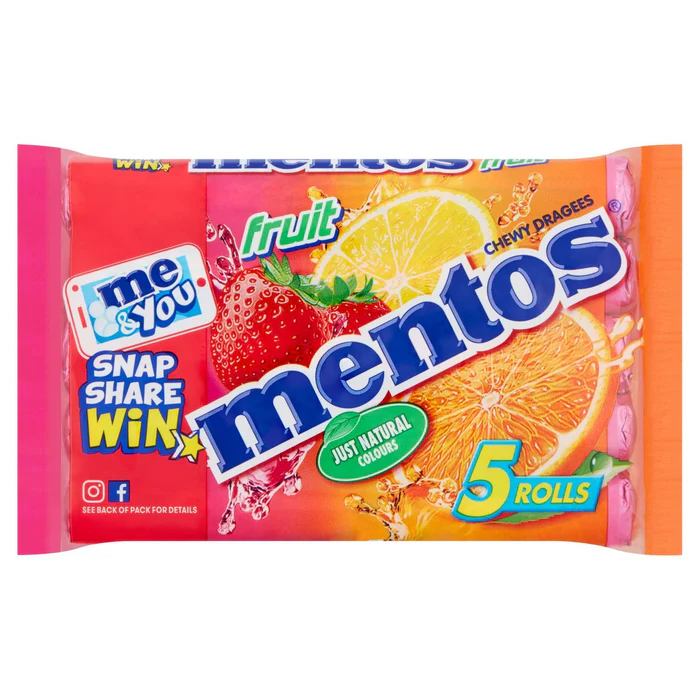 Made only from natural flavors, Mentos Fruit are refreshing and fruity chews in strawberry, lemon and orange flavors. This great value 5 roll multipack is ideal for sharing, enjoying now, or saving in the cupboard for later! After all, who says No To Mentos? Suitable for vegetarians.