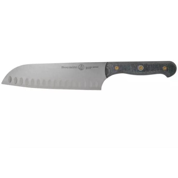 Le Messermeister Custom santoku est un couteau de cuisine tranchant comme un rasoir et pratique. Le santoku est un couteau de cuisine originaire du Japon. C’est la version japonaise du couteau de chef européen. Ce couteau allie le style japonais à la robustesse allemande. Tout comme un couteau de chef, vous utilisez le santoku pour couper la viande, le poisson et les légumes. Les fossettes de la lame garantissent que tout ce que vous coupez ne collera pas à la lame.
