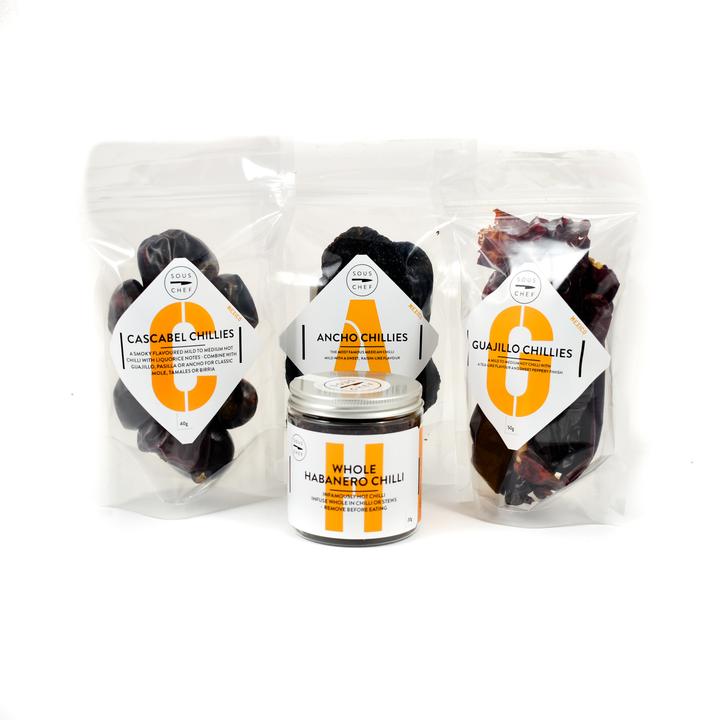 Discover the difference between the mild fruity-smokiness of ancho and the chocolatey warmth of guajillo, with this Mexican chilli selection.