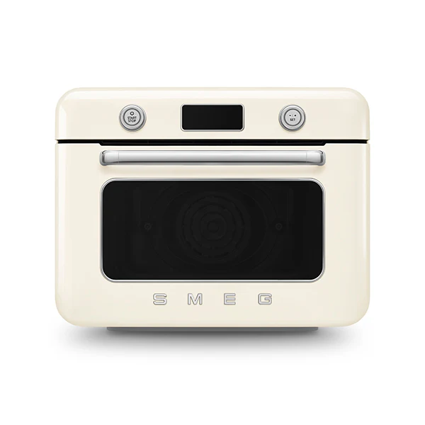 Découvrez le mini-four combiné vapeur crème COF01CREU de Smeg : Le petit électroménager idéal pour une cuisson précise, intuitive et savoureuse.