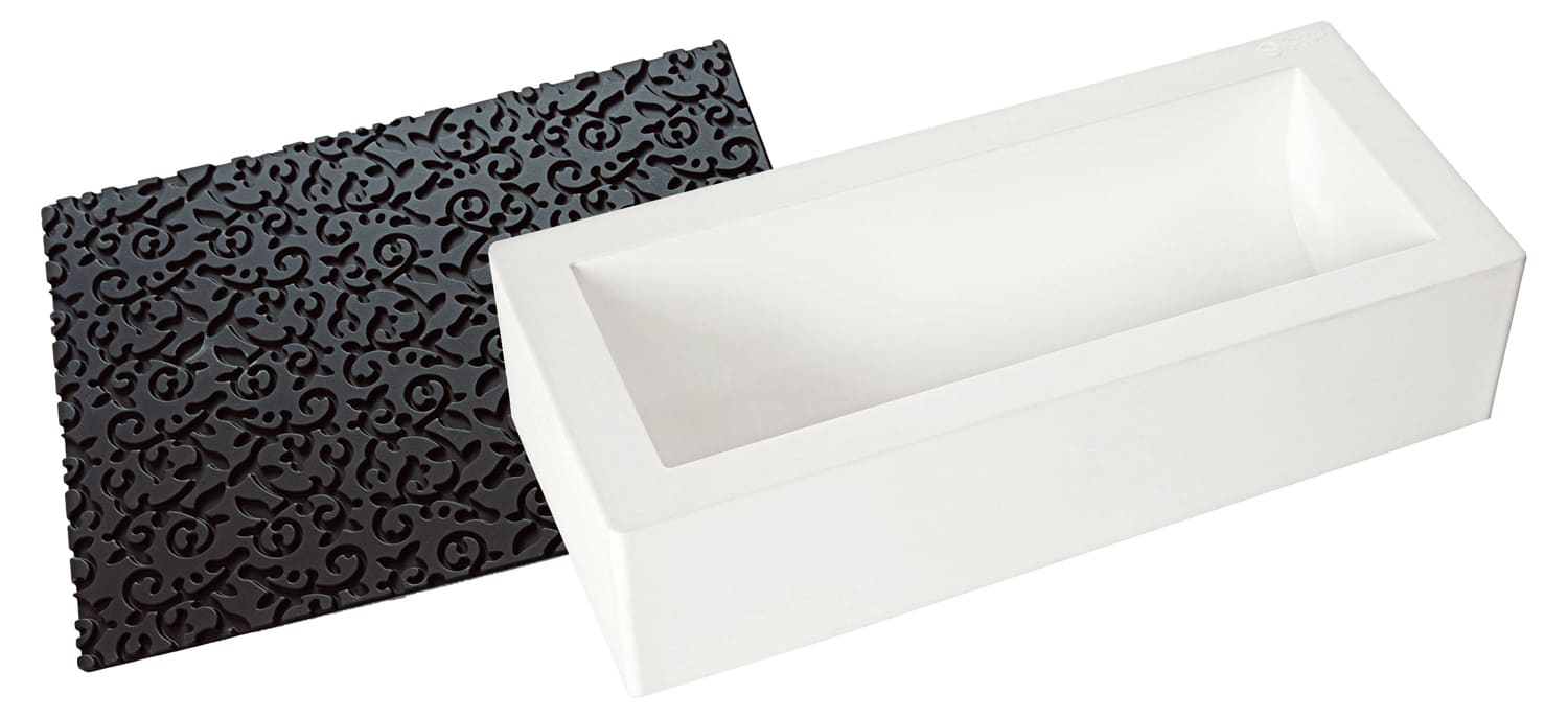 Kit pour préparer des bûches originales qui se compose d’un tapis en silicone texture arabesque et du moule à bûche en silicone.