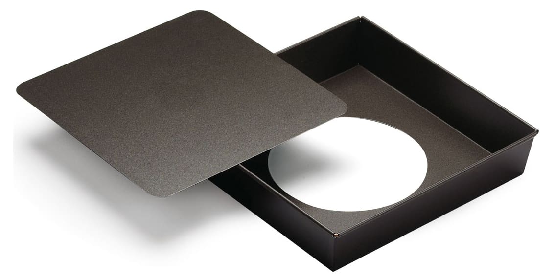 Moule à manqué carré en acier, fond mobile, à revêtement anti-adhérent. Bordé sur fil.