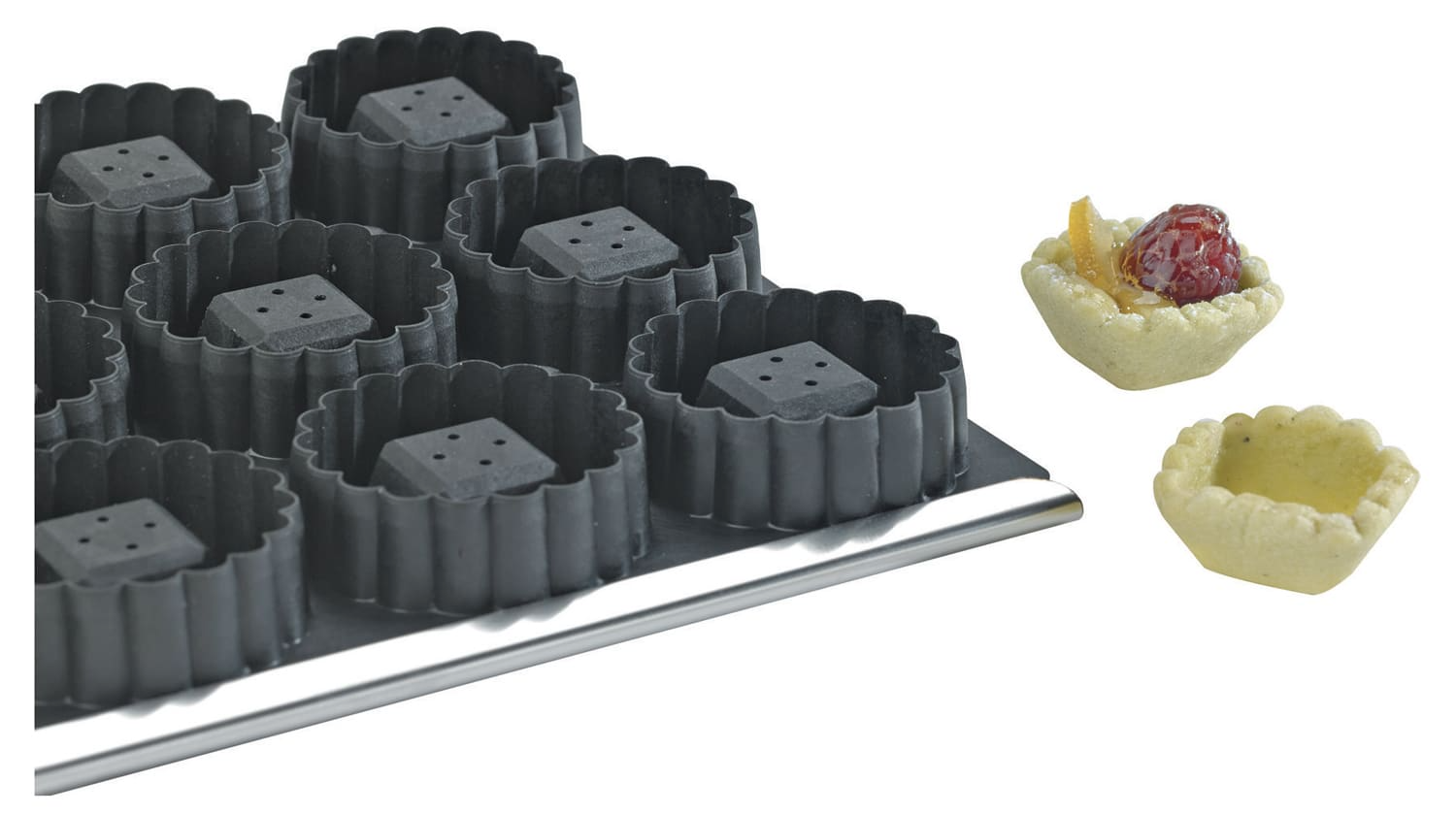 Nouvelle conception de moules sur plaque permettant de réaliser très rapidement des fonds de tartelettes sans fonçage. Moule en 3 parties composé d’une plaque support en aluminium, d’une plaque de découpe et d’une plaque de mise en forme en matériau composite -20 à +170°C.