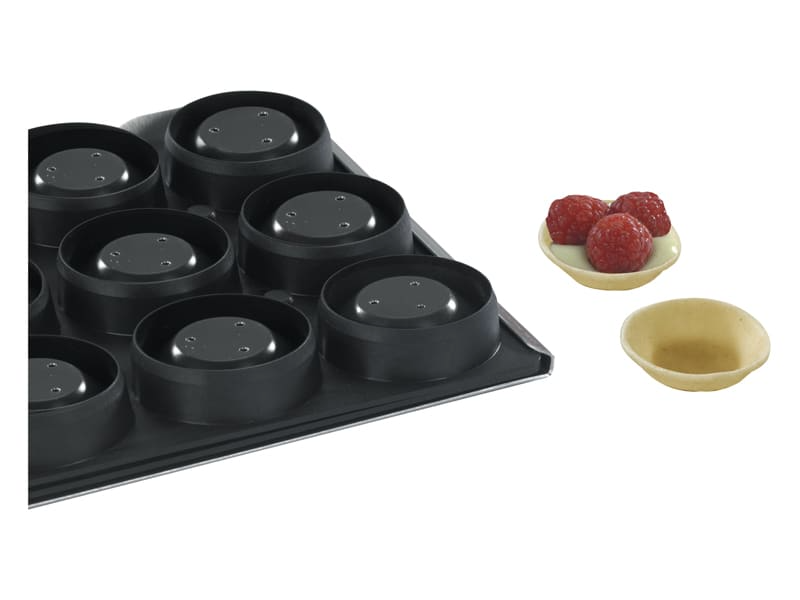 Nouvelle conception de moules sur plaque permettant de réaliser très rapidement des fonds de tartelettes sans fonçage. Moule en 3 parties composé d’une plaque support en aluminium, d’une plaque de découpe et d’une plaque de mise en forme en matériau composite -20 à +170°C.