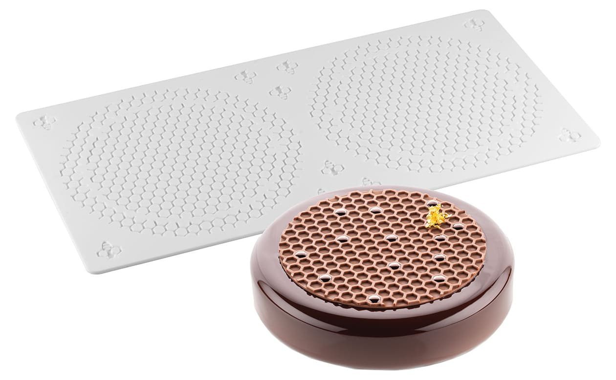 Ce moule en silicone vous permettra de réaliser des décors de forme “nid d’abeille”, en chocolat sans congélation, ou en mousse, crème, confit de fruit, ganache montée… avec congélation.