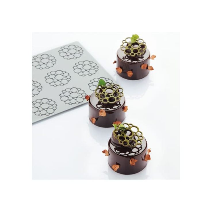 Ce moule propose une finition décorative sophistiquée, grâce à lui réaliser des opalines, dentelles, des décors géométrique ou autour des bulles.