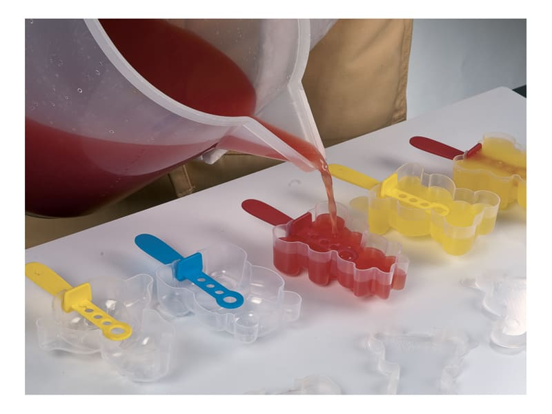 Moules en polypropylène avec couvercle et bâtonnets pour la fabrication de sucettes à base de sorbet. Incorporation pratique des bâtonnets plastiques, avec parfait maintien.