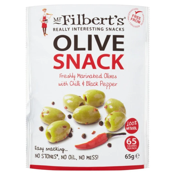 Mr Filberts Olive Snacks Pitted Green Olives with Chilli & Blackpepper 65g