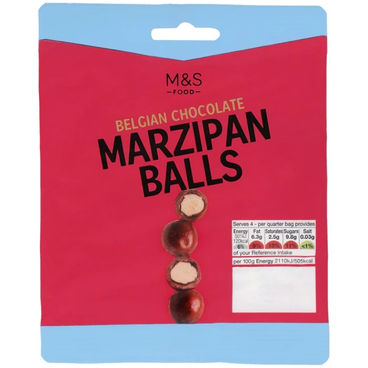 M&S Belgian Chocolate Marzipan Balls. Marzipan balls layered with smooth Belgian dark chocolate and coated in creamy Belgian milk chocolate. Store in a cool, dry place. Suitable for vegetarians.