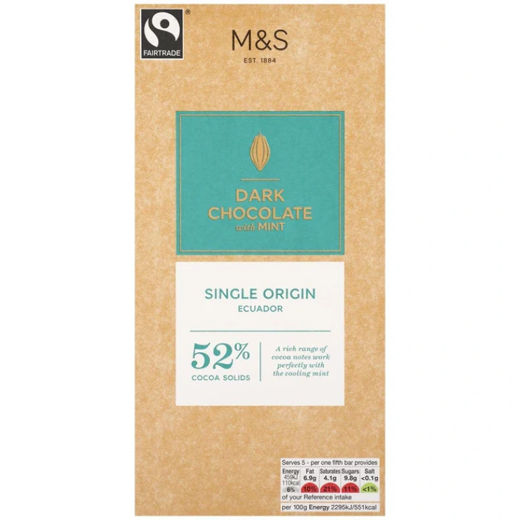 M&S Fairtrade 52% Cocoa Dark Chocolate with Mint. Single-origin rich dark chocolate specially sourced from Ecuador with cooling and refreshing notes of mint. Store in a cool, dry place. Serves 5. Fairtrade provides a better deal for producers in developing countries, creating opportunities for farmers and workers to improve their lives, their communities and protect their environment.