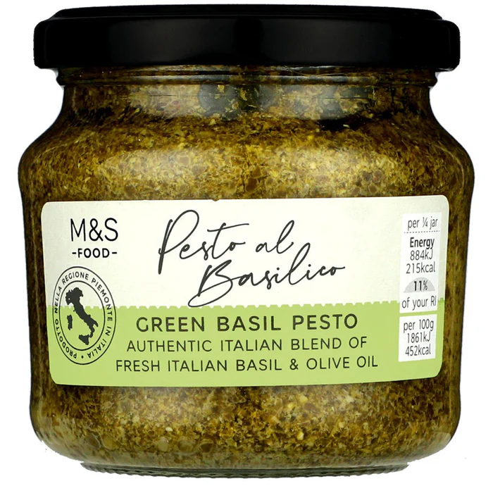 M&S Made In Italy Green Pesto. Made with Italian basil and olive oil, this green pesto is perfect for mixing in dips and pasta dishes, or adding to salad dressings for extra flavor.