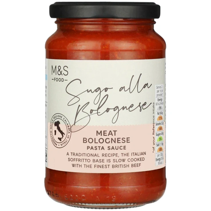 M&S Made In Italy Bolognese Pasta Sauce. A rich slow-cooked ragu made with minced British beef, Italian pork and tomatoes, simmered with onions, garlic and extra virgin olive oil. Heat gently over the stove, add to pasta and finish with grated Parmesan cheese. Serves 2.