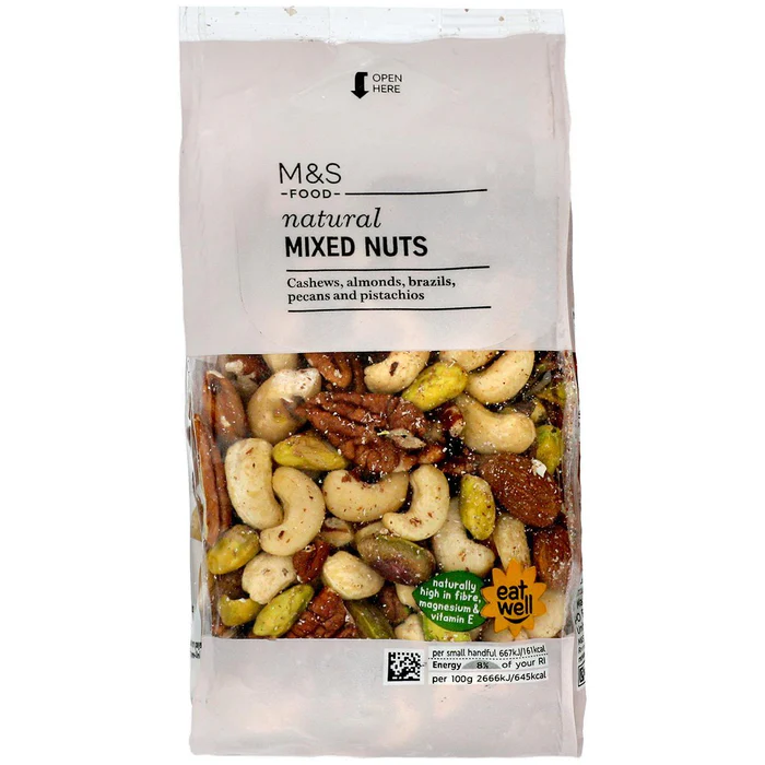 Cashew Nuts (30%), Almonds (20%), Pecan Nuts (20%), Hazelnuts (10%), Pistachio Nuts (10%), Walnuts (10%)