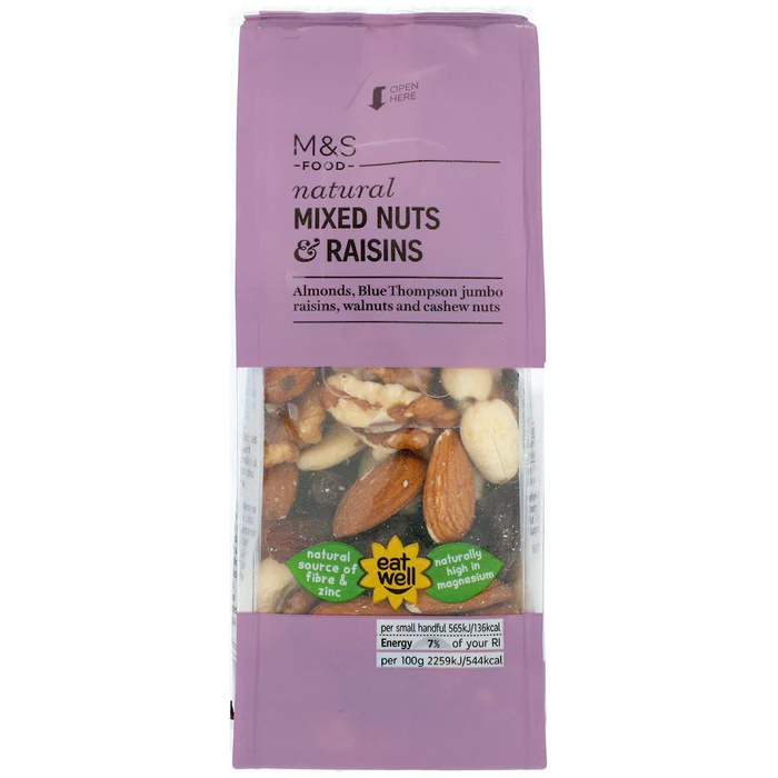 Almonds (35%), Blue Thompson Jumbo Raisins (25%) (Raisins, Sunflower Oil), Walnut Halves (20%), Cashew Nuts (20%)