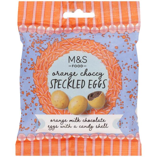 M&S Orange Choccy Speckled Eggs. Orange flavoured chocolate mini eggs and sugar pieces in a speckled candy shell. Perfect for snacking on. Milk chocolate eggs with an orange flavoured candy shell, Suitable for vegetarians