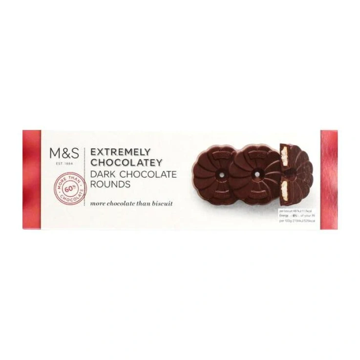 M&S Extremely Chocolaty Dark Chocolate Rounds. More chocolate than biscuit, these chocolaty shortcake biscuit rounds are fully coated in dark chocolate for an intense, rich flavor. Perfect for sharing. 100% of the palm oil in M&S products is responsibly sourced and certified by the RSPO. More information on the M&S palm oil strategy can be found on the M&S corporate site.
