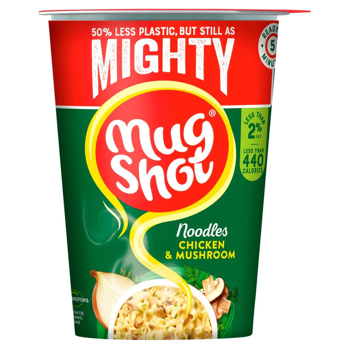 When you’re feeling ravenous, take time out for a few delicious minutes with the mighty Mug Shot, the big, comforting, flavor-packed snack. It’s the perfect XL pick me up. Ready in 5 Minutes, Less Than 2% Fat and 440 Calories, Made with Natural Flavors, No Artificial Colors, Suitable for Vegetarians.