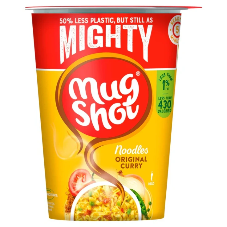 When you’re feeling ravenous, take time out for a few delicious minutes with the mighty Mug Shot, the big, comforting, flavor-packed snack. It’s the perfect XL pick me up. 50% Less Plastic, But Still as Mighty, Ready in 5 Minutes, Less than 1% Fat, Less than 430 Calories, Chili rating – Mild – 1, Made with Natural Flavors, No Artificial Colors, Suitable for Vegetarians.