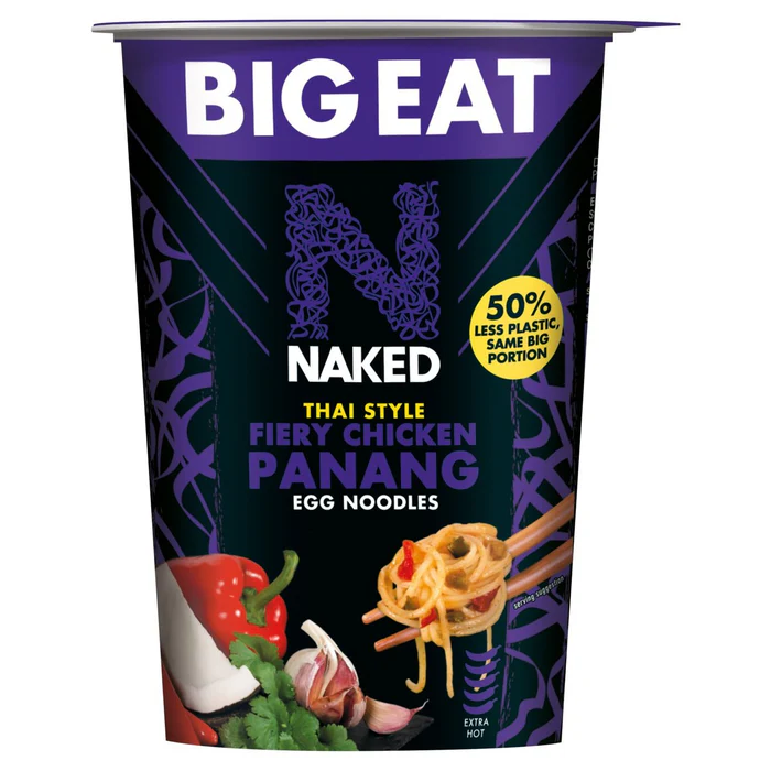 Bursts of chili and a scattering of spices add heat, lifted by lively, fragrant coriander. All held together with smooth rich coconut flavors. Chili rating – extra hot – 5, 50% less plastic, same big portion, Egg noodles in a spicy chicken panang flavor sauce, A source of protein, Less than 1% fat, Less than 430 kcal, No artificial colors.