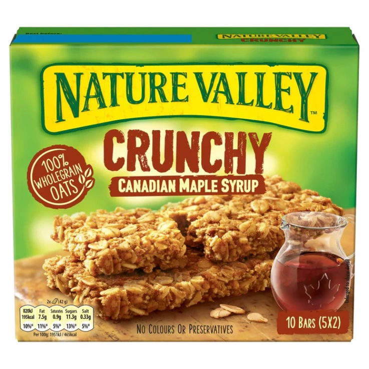 Crunchy bars for breakfast, morning snack or on-the-go snack, Nature Valley Crunchy Canadian Maple Syrup Cereal Bars, Packed with wholegrain oats and real ingredients, 100% Wholegrain Oats, Lactose free, No Colours or Preservatives, Great tasting bars with no artificial flavours, colours or preservatives, Suitable for Vegetarians