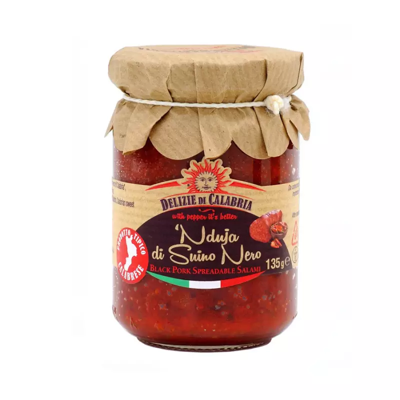 The ‘Nduja di Suino Nero 135 gr Delizie di Calabria is a soft, spreadable and decidedly spicy salami that is part of the most authentic and typical flavours of Calabria. It is distinguished by its intense red colour, given by the dried red chilli pepper naturally present in the mixture together with the fatty parts of the pig. Originally from Spilinga, ‘nduja is now produced throughout the region, representing a true emblem of Calabrian culinary culture. This one in particular is made from black pork, a prized native Calabrian breed. Ideal for spreading on bread, it is also perfect as a topping for pizza, bruschetta or as an ingredient to prepare tasty sauces for pasta.