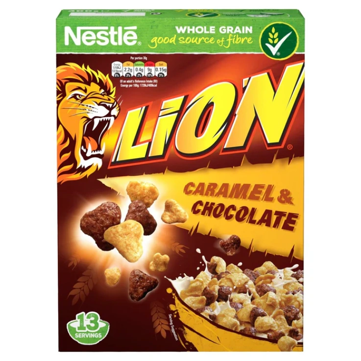 Experience the great flavour sensation of Nestle Lion wholegrain breakfast cereal. An indulgent combination of scrumptious chocolate cereal pieces combined with yummy caramel cereal pieces make LION the king of cereals! Contains 9 vitamins and minerals, including calcium and iron. It’s made with 39% whole grain and is a source of fibre.