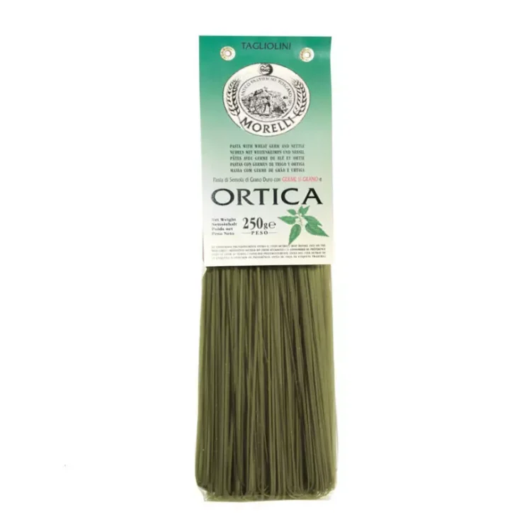 Tagliolini all’Ortica dell’Antico Pastificio Morelli are perfect for those who love dishes with an unexpected and original flavour in the kitchen. They are characterised by the presence of wheat germ, rich in vitamins and vegetable proteins. The pleasantly bitter taste of nettle makes them perfect with fresh tomato sauces.