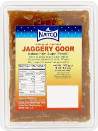 Jaggery is a dark, coarse, and unrefined sugar made from sugar cane juice or the sap of a variety of palm tree. It has a sweet, rich and fudgey caramel flavour and can be used in any dish you would use normal sugar for to add extra flavour. Natco jaggery goor comes in a solid block and is used for making of Indian sweets, or when crushed can be sprinkled on cakes. In southern Indian cooking sweet jaggery is used to balance heat in curries. Or try it as a flavourful alternative to ordinary sugar in your tea or coffee – to add a real taste of distiction. Jaggery is in fact often called unrefined cane sugar.