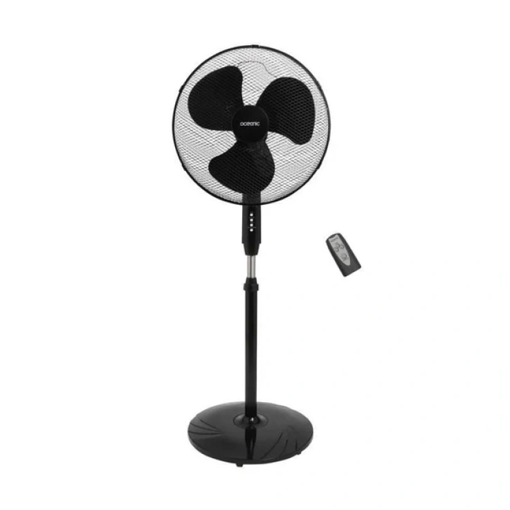 OCEANIC – Ventilateur de pied 44 cm – 45 W – 3 vitesses – Fonction rotative/inclinable – Hauteur réglable jusqu’a 125 cm – 3 pales – Télécommande – Minuterie réglable de 0.5 a 7.5 h – Noir