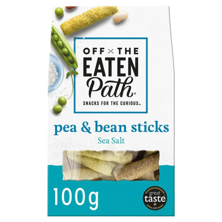 Deliciously crisp pea and bean sticks simply seasoned with sea salt. Made with real vegetables. 30% less fat than regular potato crisps. Great taste 2019, Surprisingly tasty snacks made with real vegetables, A Source Of Fibre, No Artificial Preservatives, Colors Or Flavors, Suitable For Vegetarians.