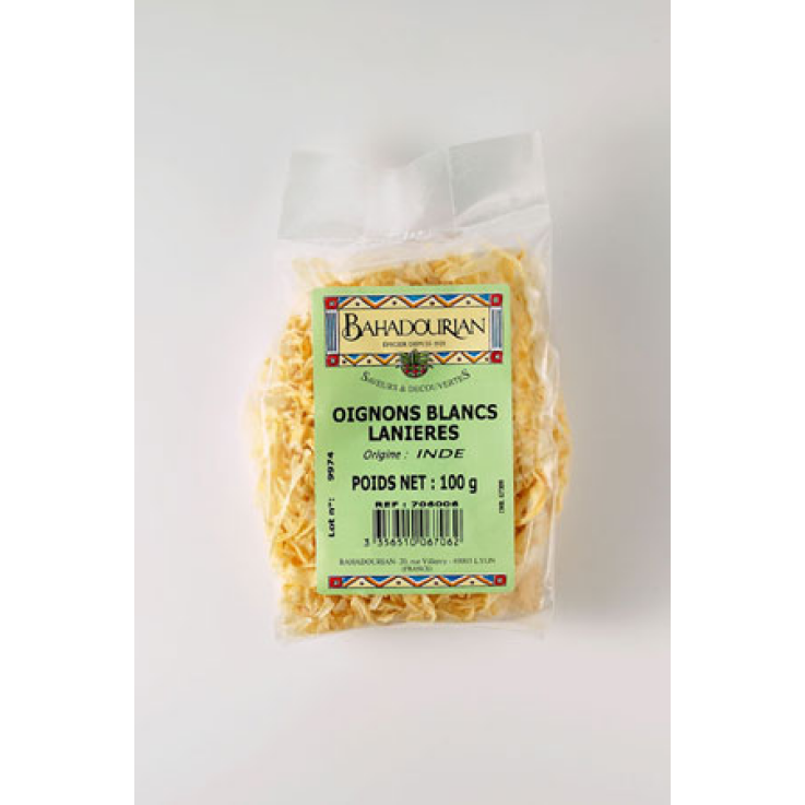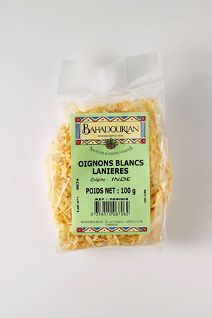 • Ingrédients : Oignon Blanc en Lanières. Conditionné dans un atelier qui utilise: CÉLERI, SÉSAME, NOISETTE, PISTACHE, GRAINES DE MOUTARDES, GLUTEN, SULFITES, OEUFS, SOJA, LAIT.