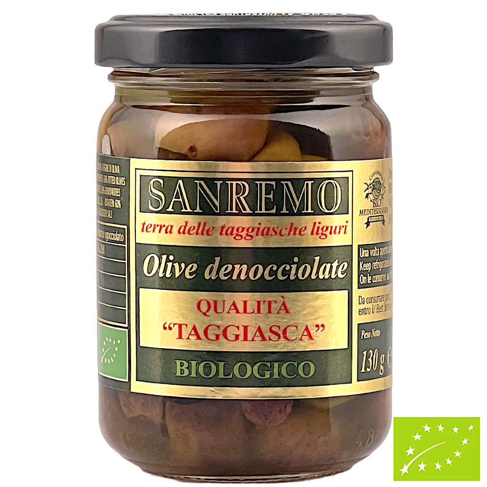 Olives Taggiasca biologiques dénoyautées à l’huile d’olive extra vierge Pot de 130 g – Bio Mediterranea