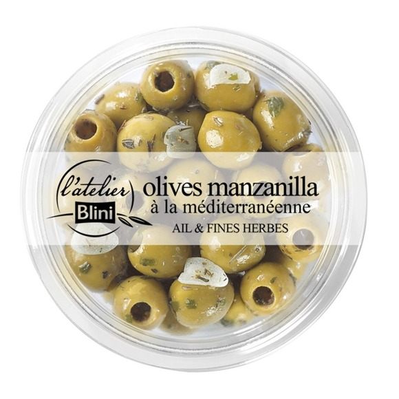 Olives Manzanilla, ail et fines herbes. Pays de fabrication : FRANCE DLC minimum garantie: 7 jours