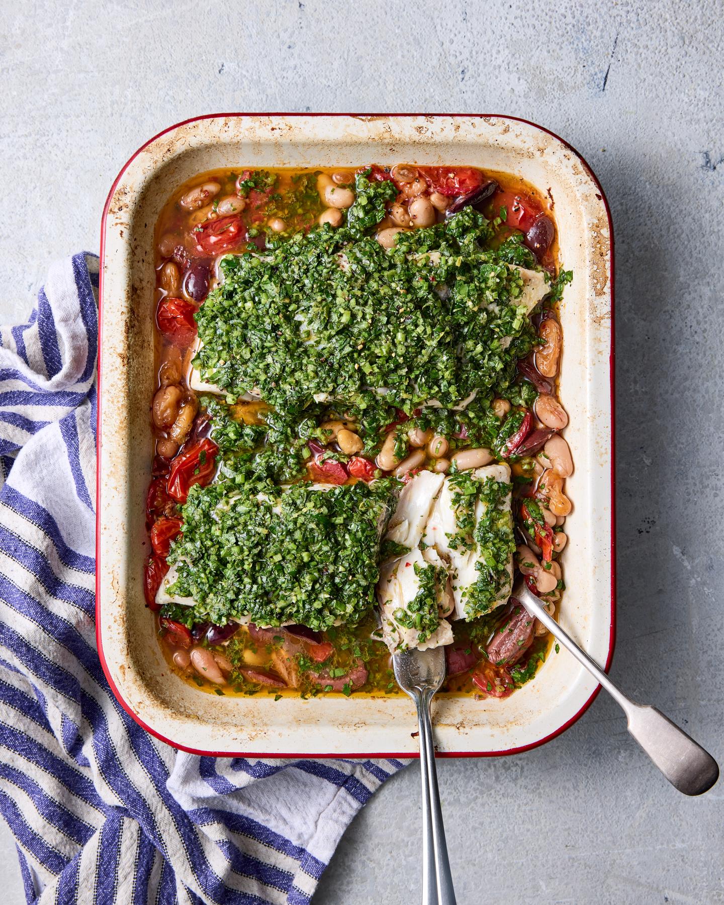 One tray meals are a dream dinner, and my favourite way to eat fish. The base of this recipe is delicious – garlicky white beans, cherry tomatoes and olives.