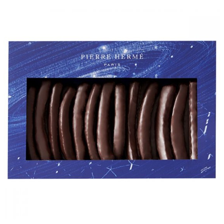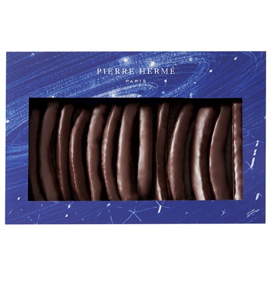 Aiguillettes d’écorces d’oranges confites enrobées de chocolat noir pur origine Mexique (64% de cacao minimum, pur beurre de cacao).