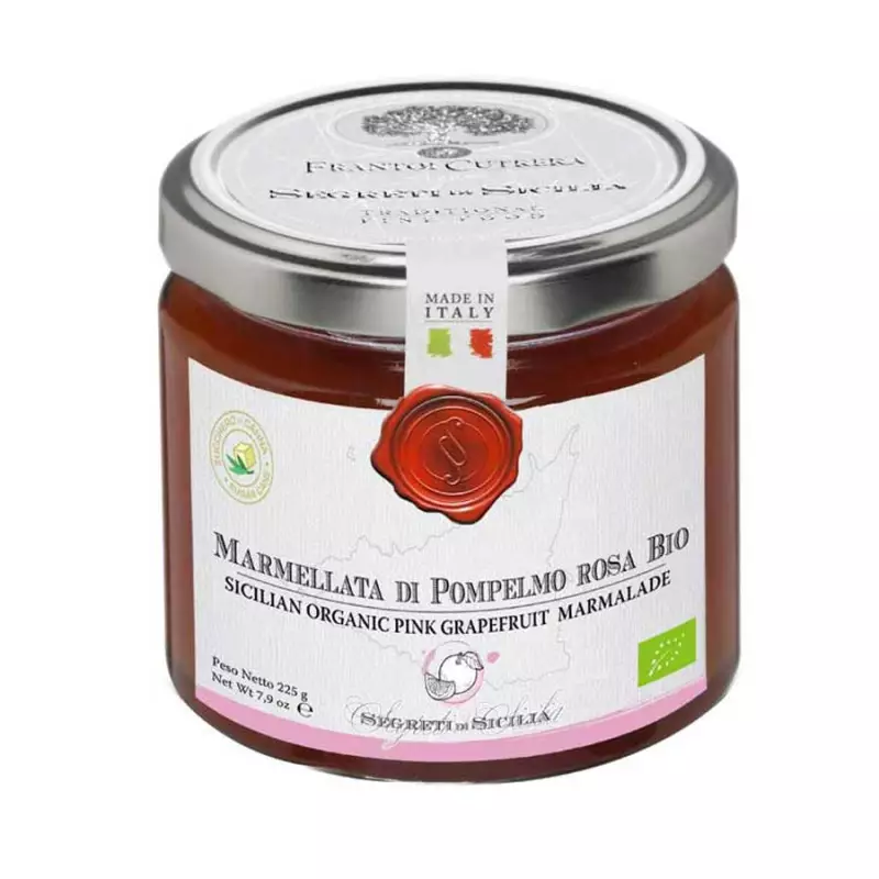 Segreti di Sicilia BIO Pink Grapefruit Marmalade is made with tasty pink grapefruits picked in the Syracuse area, processed using a low-temperature cooking process that preserves their authentic flavour, intense colour and valuable nutritional properties. With its characteristic deep pink colour, this jam is distinguished by the perfect balance of sweet and bitter, thanks to the use of organic cane sugar. It is ideal to spread on toast for a refined breakfast, to accompany yoghurt and fresh cheese or as a special ingredient in the preparation of cakes and desserts. A unique and refined taste experience, perfect for those who love the authentic flavours of Sicily.