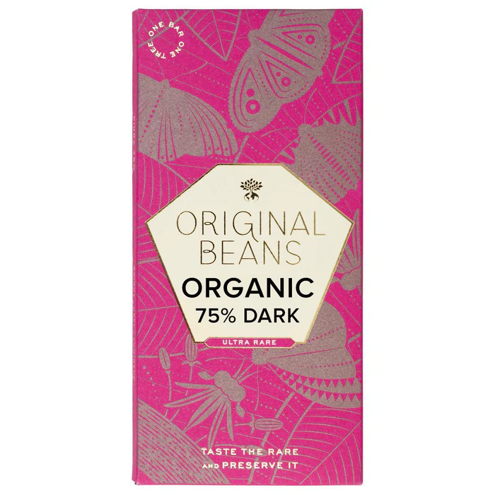 Original Beans Organic Peruvian Dark Chocolate Piura Porcelana 75%. Flavors of lime, dried prunes and pecan divulge the secrets of this ultra-rare white cacao, conched into a dark, organic vegan chocolate bar. Piura Porcelana 75% chocolate is made with beans sourced straight from growers in the Piura Valley, Peru. Each purchase of bright Piura 75% helps the region’s endangered cocoa beans and even brighter butterflies stay aloft. Organic. Suitable for Vegetarians.